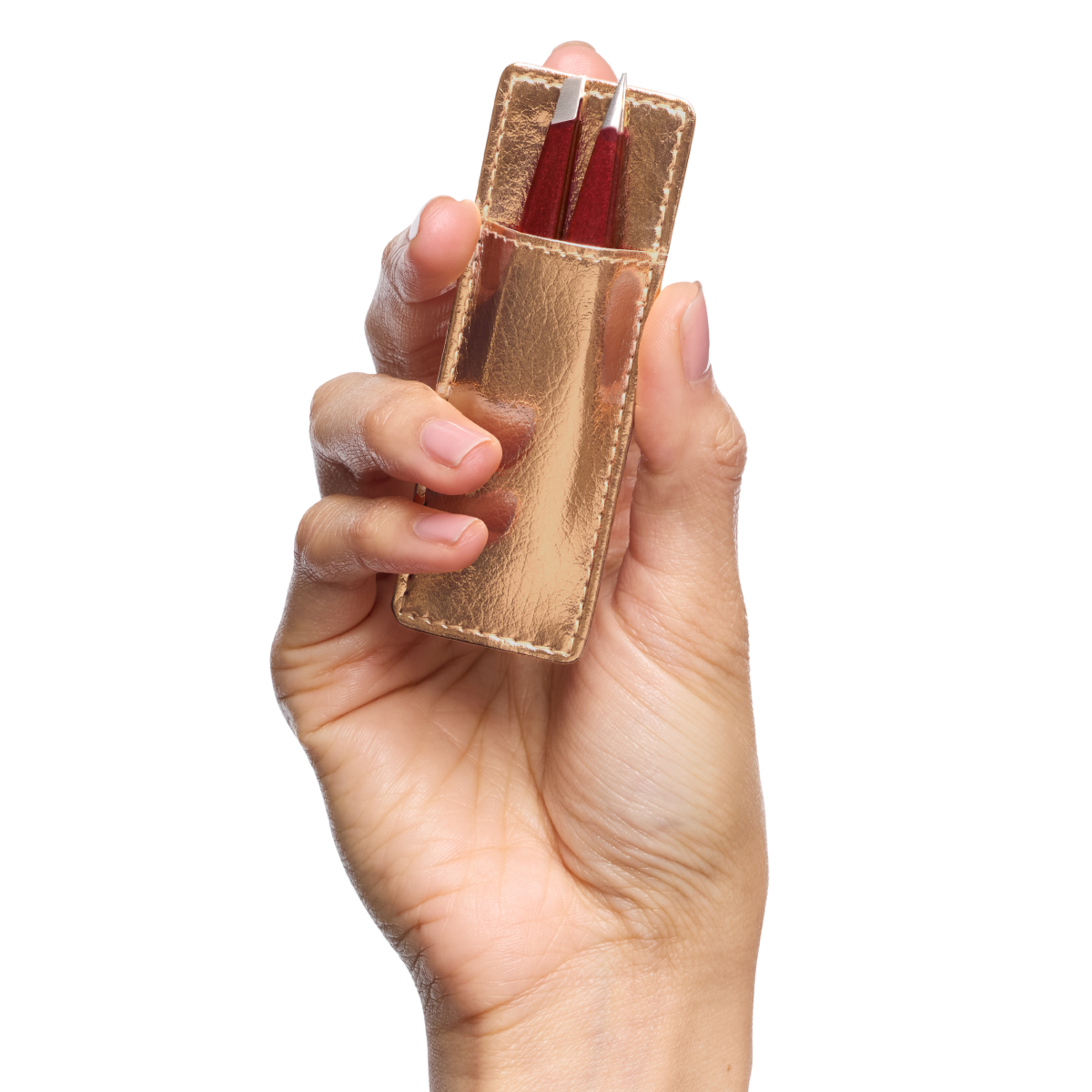 Egy elegáns tok és két mini csipesz – egy ferde (Slant) a szemöldök formázásához és definiálásához, valamint egy hegyes (Point) a finom és benőtt szőrszálak precíz eltávolításához.